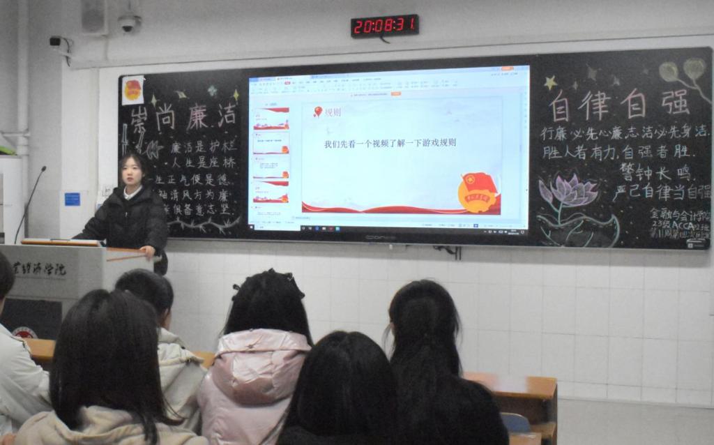 随着团歌的嘹亮响起,各团支部组织的团课相继开展。在本次团课中我们主要邀请学生代表分享有关廉洁的小故事,让同学们在每一个小故事中都能得到感悟,并认识到廉洁的重要性。此外我们还开展了与廉洁和自律相关的游戏,充分调动了同学们的积极性,使同学们都积极参与进来,团课氛围十分活跃。通过本次团课同学们了解了廉洁并培养了自律意识,为做好自律自强打下了坚实的基础。
