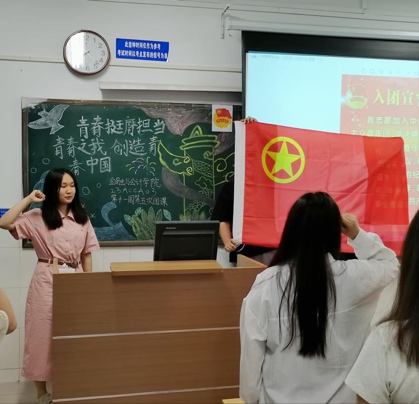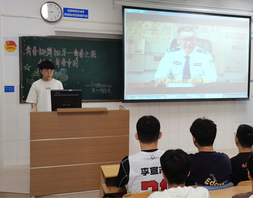 伴随着嘹亮的团歌声,各班团课活动相继展开。首先,各团支书为同学们播放了习近平总书记对广大青年的五四寄语,引导同学们要“立志做有理想、敢担当、能吃苦、肯奋斗的时代好青年”,奋力书写为中国式现代化挺膺担当的青春篇章。接着,各团支书带领广大团员重温入团誓词,进一步增强团员意识,强化团员的责任担当,团结带领广大同学听党话,跟党走。最后,团支书邀请同学们进行青春励志故事分享,激发了同学们向前奋斗的激情,鼓励同学们要突破重重障碍,最终实现自己的人生价值