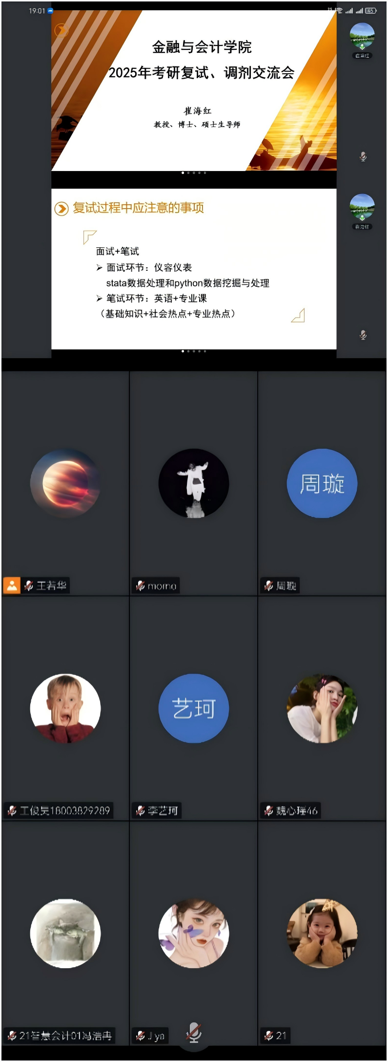 辅导会上,崔院长结合多年研究生招生经验,对2025年考研形势做了总体分析,系统地梳理了复试流程与备考要点。针对笔试环节,提醒学生需扎实巩固专业基础及英语基础,关注学科前沿动态;面试方面,强调仪态仪表、逻辑表达与临场应变能力的重要性。针对不同专业特点,崔院长对会计、金融、审计、投资等专业分别进行复试重点解析,并要紧扣时政热点与学术热点,结合当前学科发展趋势等社会热点,多维提升竞争力。同时,崔院长就调剂政策、院校信息搜集等实操问题提供具体建议,提醒学生把握黄金时间窗口。