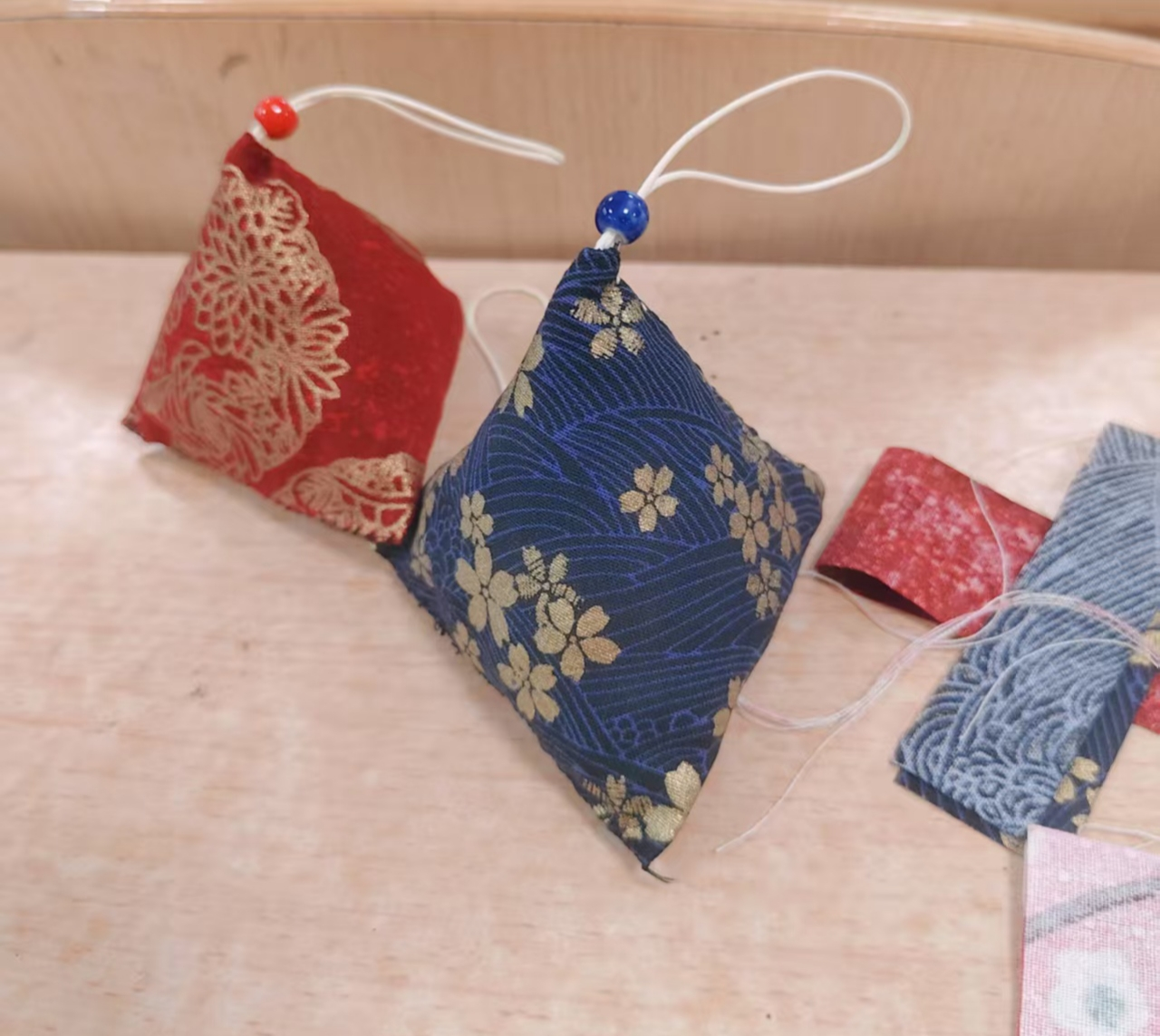 活动现场,工作人员首先为同学们详细讲解了端午香包的历史渊源、文化寓意以及制作流程。讲解结束后,同学们有序领取包括布料、艾草、针线以及用于装饰的珠子等制作材料。在制作环节,同学们充分发挥自己的审美与创意。大家或是专注地穿针引线,或是与身旁同学轻声交流制作技巧,现场气氛热烈而融洽。
