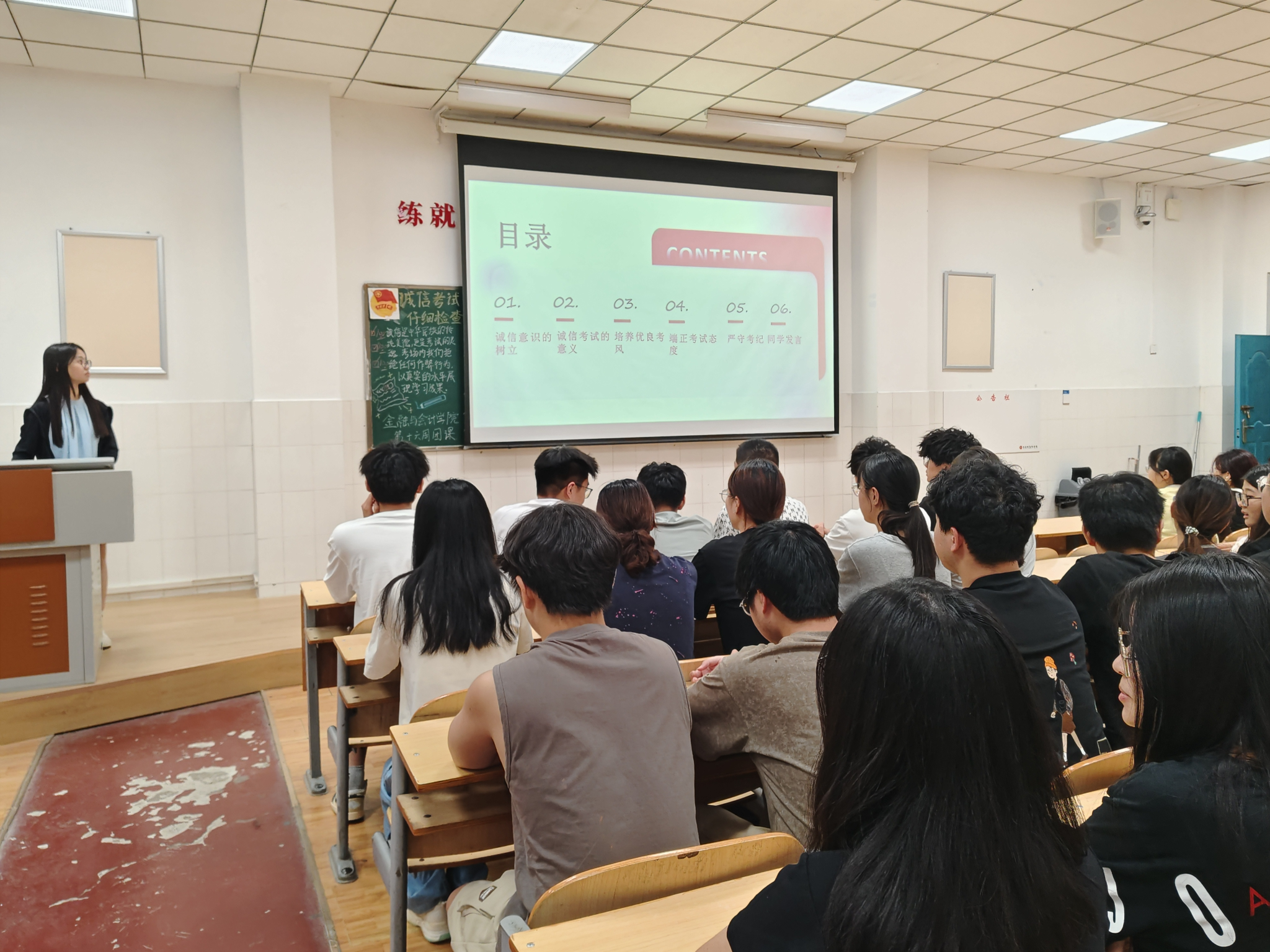 本次团课在团歌声中拉开帷幕。首先,由各班团支书组织同学们学习了学校关于考场纪律的相关规定,重申了考试作弊的后果和处理办法。随后,通过观看典型违纪案例警示短片,同学们认识到投机取巧行为的严重危害性。最后由同学上台分享了对"诚信"的理解,表达了对作弊行为的坚决抵制。此次活动使诚信应考的观念深入人心,增强了大家遵守考试纪律的自觉性。