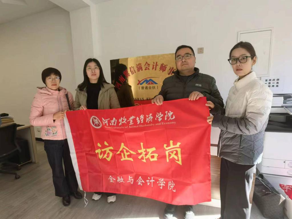 11月23日,pa电子官方网站财务管理教研室主任苗霞博士、副教授张宝丽老师、汪萍博士一行3人走进河南翼信满会计师事务所,开展访企拓岗促就业、双百助企促发展活动。