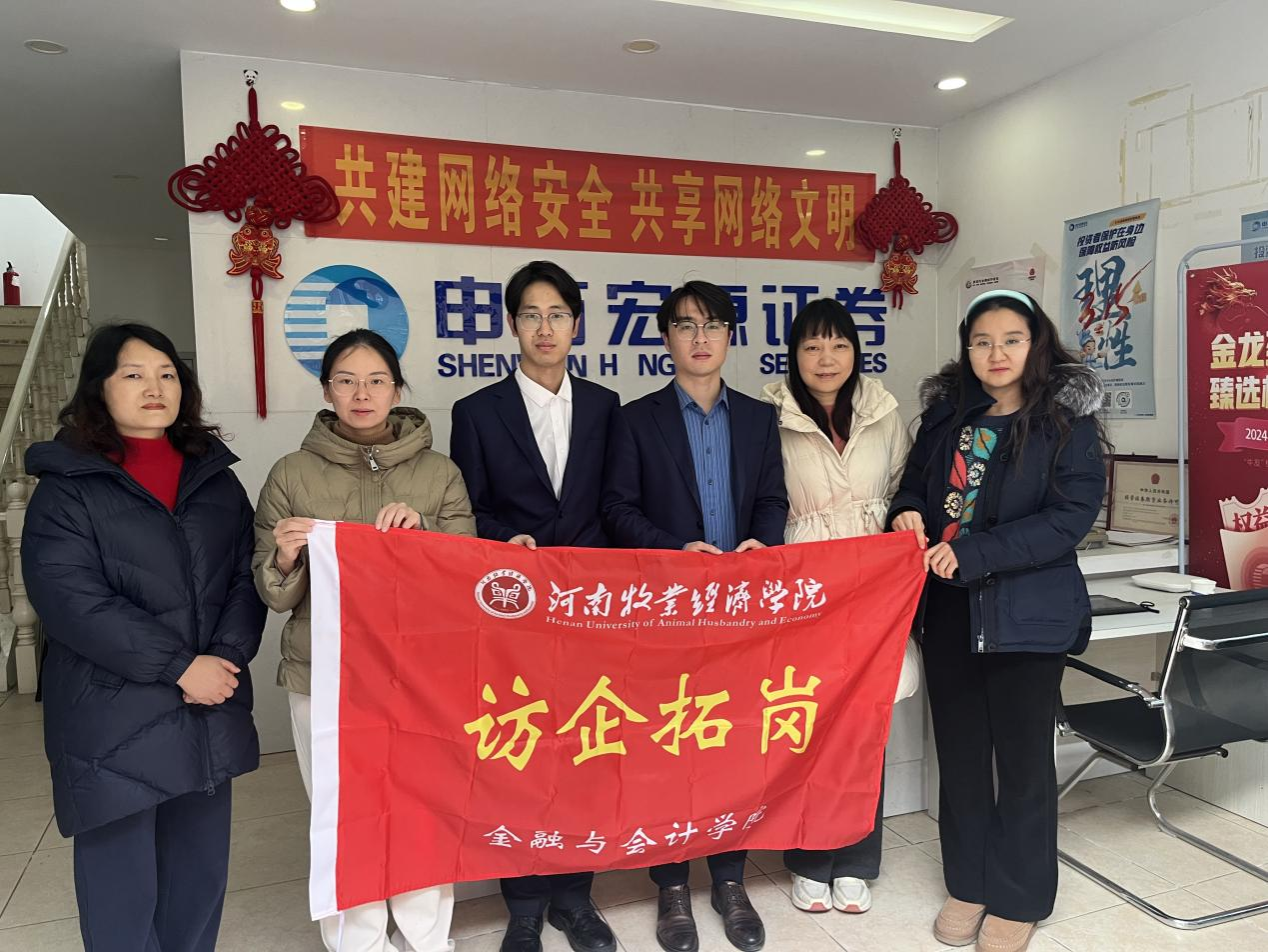 为进一步提升本科人才培养质量,扎实推进“双百”工程建设,加强校企合作,2024年12月25日下午,pa电子官方网站投资学教研室杨峰、李小典、王豪杰、李宜霖四位教师前往申万宏源证券有限公司郑州分公司开展调研交流,双方围绕人才培养需求、投资学课程体系创新、毕业生就业实习规划等进行了深入交流。