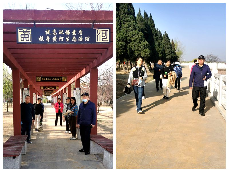 黄河岸边垂柳迎风摆动,花木葱茏。滩涂湿地水草丰茂,景色宜人。沿着河岸步行,大家三五成群,高谈嬉笑,聊工作、聊生活、聊理想、聊未来。有的健步如飞、你追我赶,有的步履轻盈、不徐不慢,时而弯腰采拾野菜,时而驻足而立,远眺黄河,大家一边欣赏初春黄河美景,一边感受着运动的快乐。健步走之后,大家齐聚在花园口记事广场,一同参观了花园口堵口纪念亭、浮雕墙、普法长廊、水情科普长廊等景点,感受黄河文化、见证治黄发展历程、感悟黄河精神。
